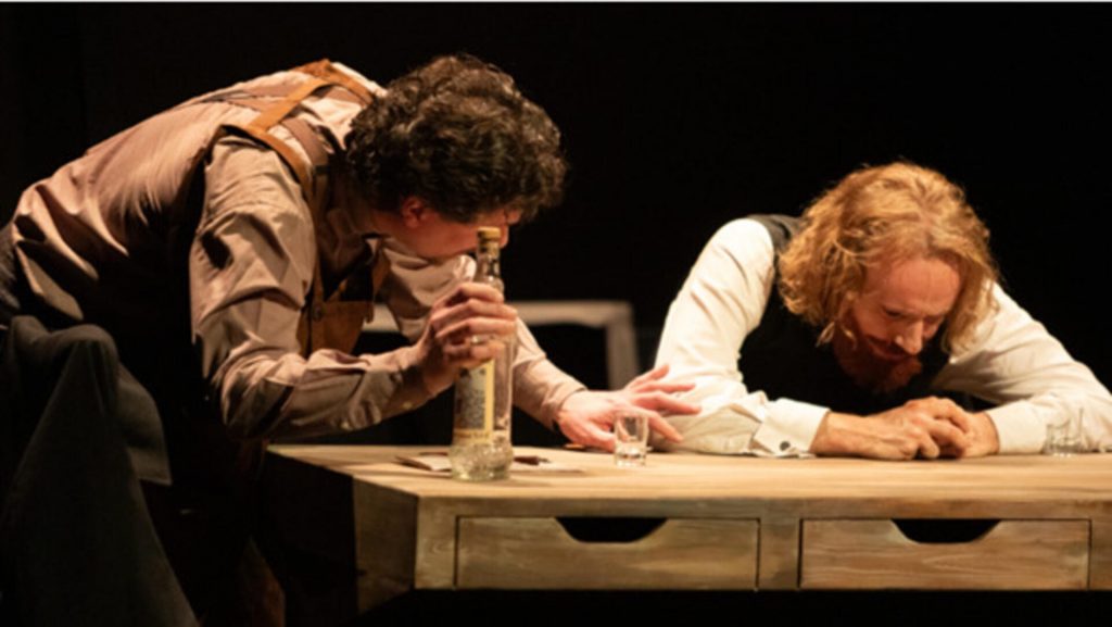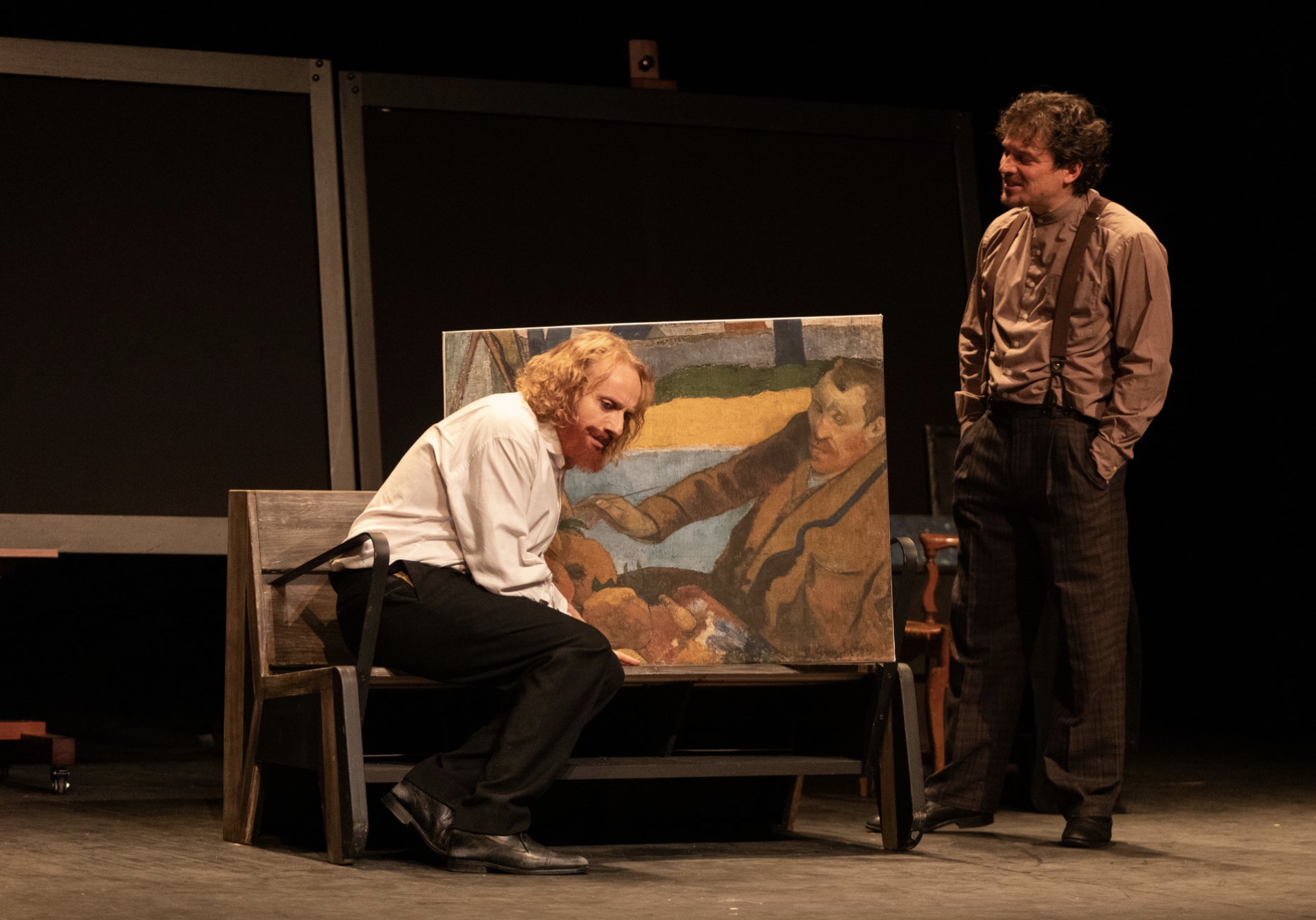 Leur duo scénique fonctionne comme un instrument à deux cordes tendues. Les scènes de travail deviennent presque chorégraphiques : Van Gogh s’avance, touche, envahit ; Gauguin recule, trace une frontière invisible. Cette tension physique structure la pièce : c’est une danse de la proximité et de la fuite. À mesure que la lumière s’assombrit, la parole se fait plus tranchante. Van Gogh cherche la fusion spirituelle, Gauguin réclame l’indépendance du geste.