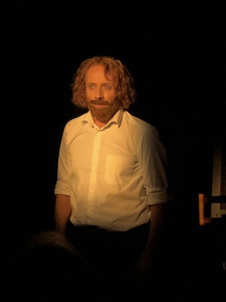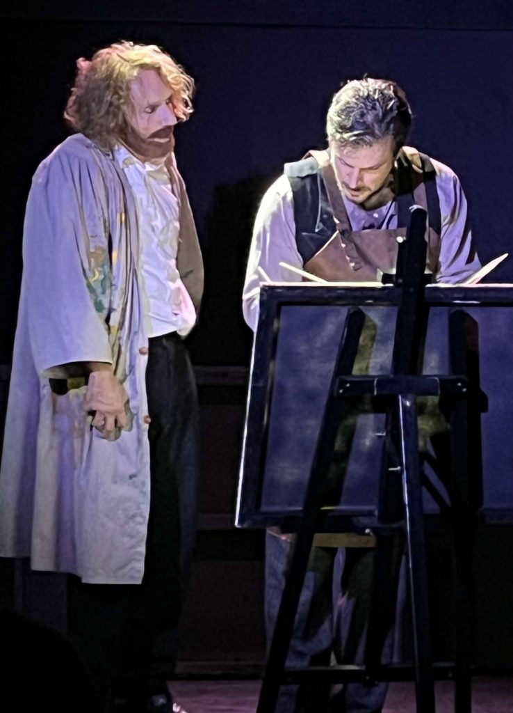Dès son entrée en scène, William Mesguich impose un Van Gogh vibrant d’humanité. Il ne compose pas un “fou génial” caricatural, mais un être en tension constante entre lucidité et vertige. Son jeu repose sur des contrastes : la vivacité du regard, les élans presque enfantins du corps, puis ces suspensions soudaines où le silence devient cri. Il fait de la folie non pas un état, mais un mouvement : un glissement progressif, un effritement de la lumière intérieure.